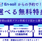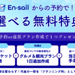 - 【En-sailトラベル1周年記念企画】選べる3大無料特典キャンペーンおかげさまで、En-sailトラベルは2025年1月に本格的にサービスを開始し、2026年2月で1年を迎えました。 みなさまへの感謝を込めて、En-sailトラベル独自特典つきの 【先着30名限定】の特別キャンペーンを実施します。 お問い合わせはこちらから 1. 選べる3大特典 本パッケージをご利用の方は、以下のA〜Cの3つからお好きな特典を1つお選びいただけます。 特典を2つ以上利用したい、追加したいという場合も1件¥1,100にて特典追加可能です! 2. 適用条件 今回のキャンペーンは、下記全てを満たす方が対象です ※国内宿泊のみではなく、航空券や新幹線等も含めた全体プラン、海外のご予約も対応です。 3. プラン料金と内訳 ご旅行代金総額としては、これまでと変わらない価格でご提供します。これまで「相談・手配料」としていただいていました2,200円を「プランニング料」とし、手配を含む料金としていただくことになります。 4. 【重要】キャンセルポリシー(必ずお読みください) トラブル防止のため、キャンセルに関しましては以下のルールを設けさせていただいております。 5. お申し込み・特典利用の流れ お申し込み・お問い合わせはこちらから 今後も変わらず、お一人お一人の満足する旅のお手伝いをさせていただきたいと思いますので、ご不明な点やご意見はお気軽にお寄せいただけますと幸いです。 En-sailトラベル代表 りん